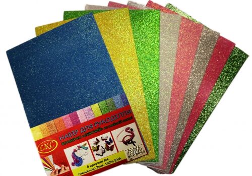 Фоамиран сверкающий на клейкой основе А4 8 листов 2мм 8цв.
